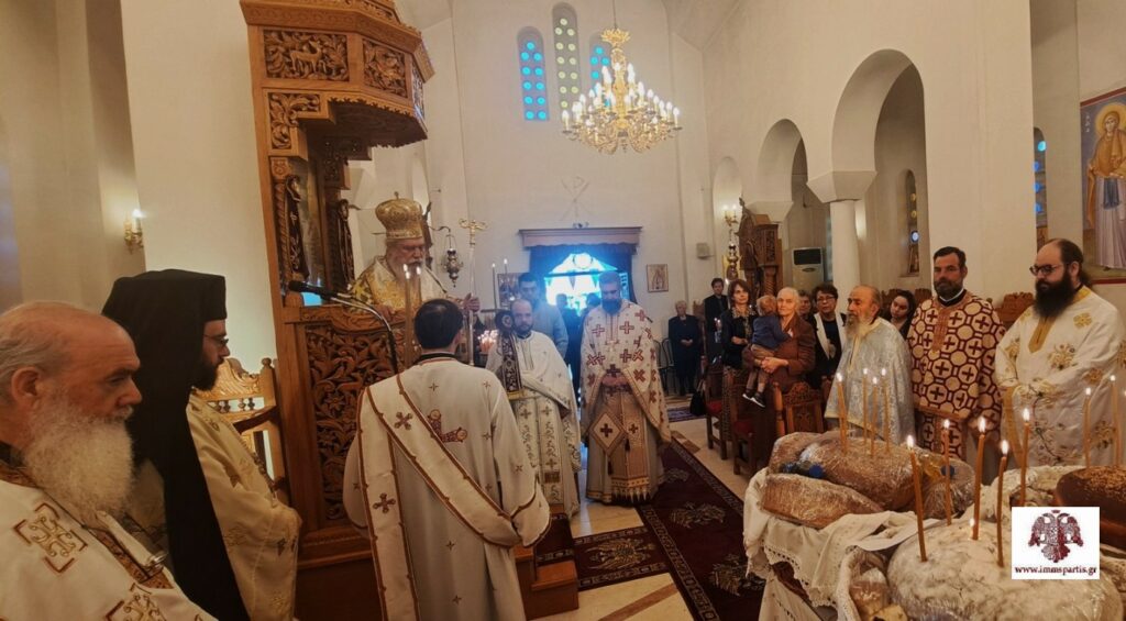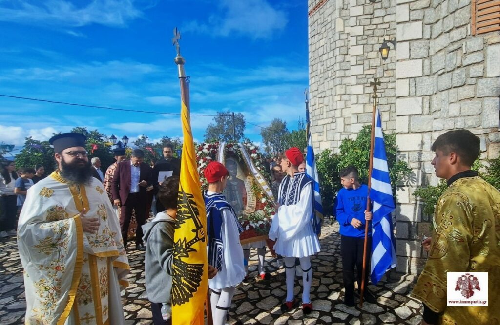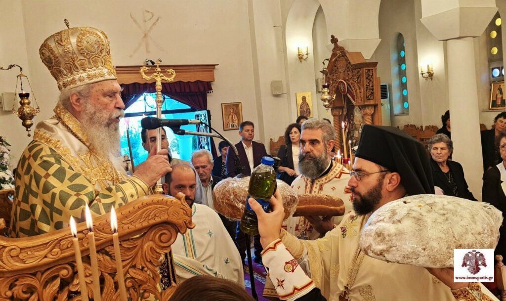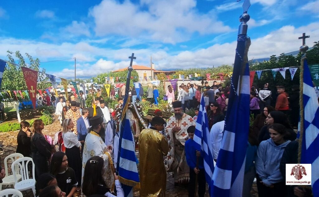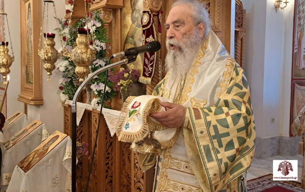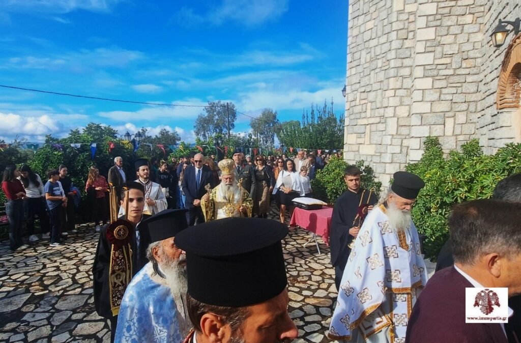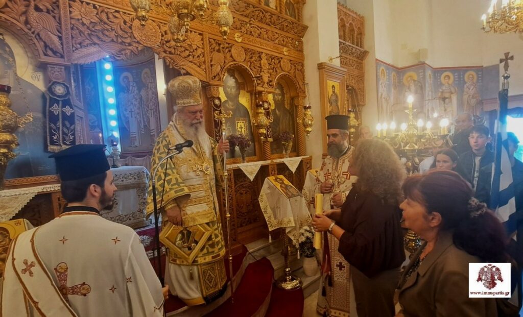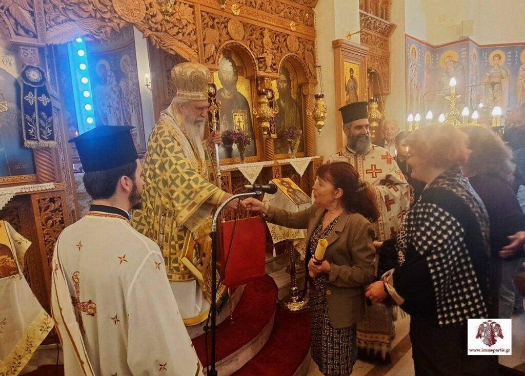 Ακολούθως, πραγματοποιήθηκε, σε κατανυκτικό κλίμα, η λιτάνευση της ιερής εικόνας του Αγίου πέριξ του Ναού. Πριν την Απόλυση, ο Σεβ. Ποιμενάρχης μας απένειμε τιμητικό έπαινο στη Δομή Διδασκαλίας της Υφαντικής Τέχνης του Πολιτιστικού Συλλόγου Γερονθρών, για τη διάσωση και μεταλαμπάδευση της παραδοσιακής αυτής χειροτεχνίας, που είναι συνδεδεμένη με την ιστορική μνήμη και την τοπική πολιτισμική ταυτότητα. Από την πλευρά τους οι εκπρόσωποι του Συλλόγου ευχαρίστησαν θερμά τον Σεβασμιώτατο για την τιμή αντιπροσφέροντας ένα συμβολικό δώρο.