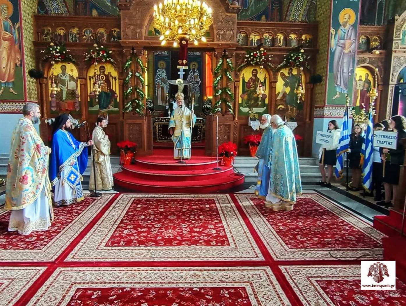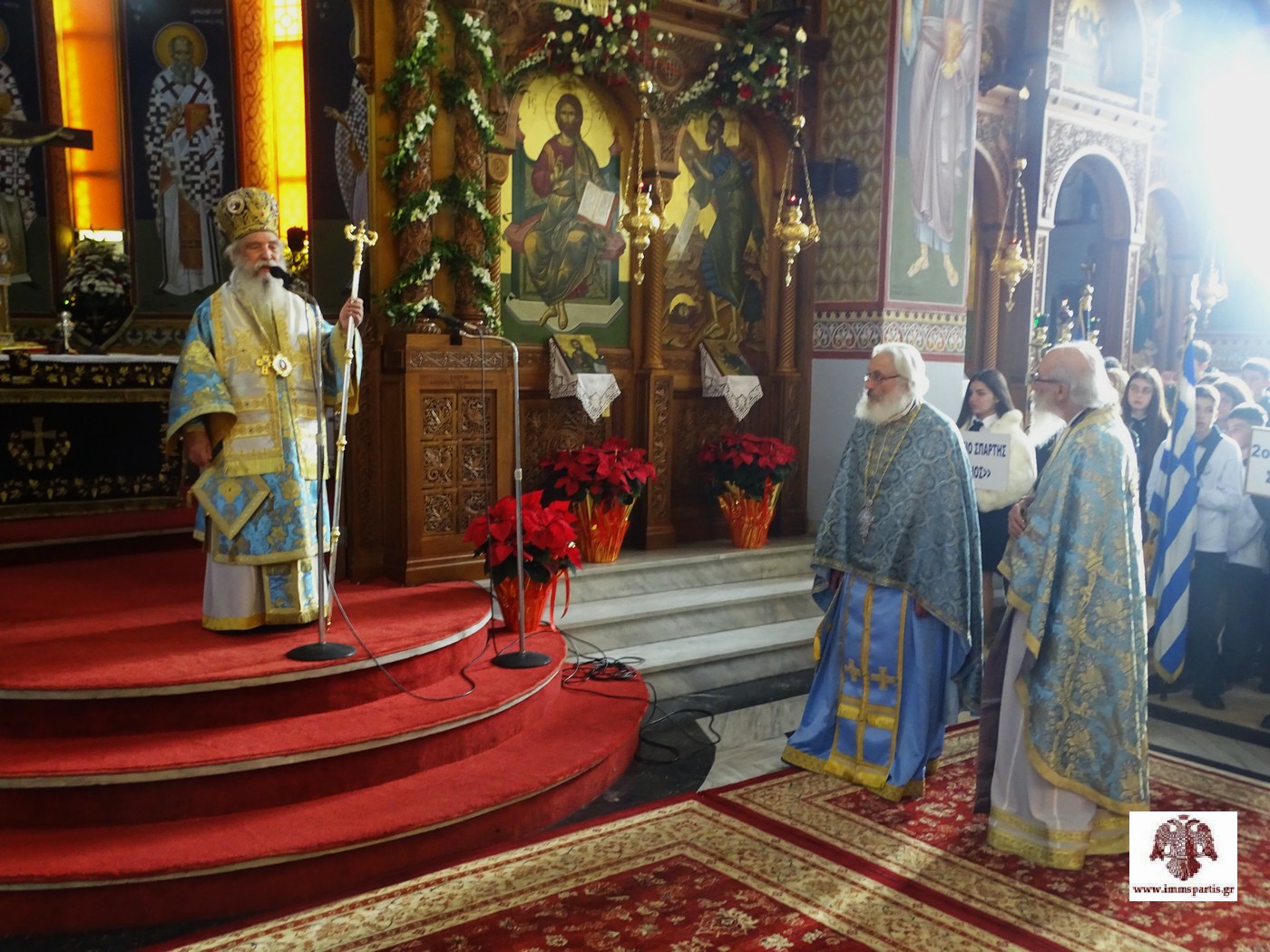 Στην ομιλία του, ο Σεβ. Ποιμενάρχης μας μίλησε για τον θεοφιλέστατο και λαοφιλέστατο Άγιο Νικόλαο, που είναι ένας από τους πιο θαυματουργούς Αγίους της Εκκλησίας μας, ενώ, αν και αρκετά μεταγενέστερος, θεωρείται απόστολος και τιμάται ιδιαίτερα. Ο Σεβασμιώτατος υπογράμμισε την βαθιά πίστη του τιμώμενου Αγίου, τη θυσιαστική αγάπη του για τον συνάνθρωπο, την πραότητα και την ταπεινότητά του, ευχόμενος να μπορέσουμε να μιμηθούμε, έστω στο ελάχιστο, τον βίο και την πολιτεία του. Ολοκληρώνοντας, μίλησε με επαινετικά λόγια για τους μαθητές και τις μαθήτριες των όμορων σχολείων της λακωνικής πρωτεύουσας, που συνοδεία των καλών εκπαιδευτικών τους, έδωσαν το παρών, αν και ήταν ημέρα που τα σχολεία δεν λειτουργούν, ενισχύοντας την ελπίδα για ένα καλύτερο μέλλον στον ευλογημένο τόπο μας.
