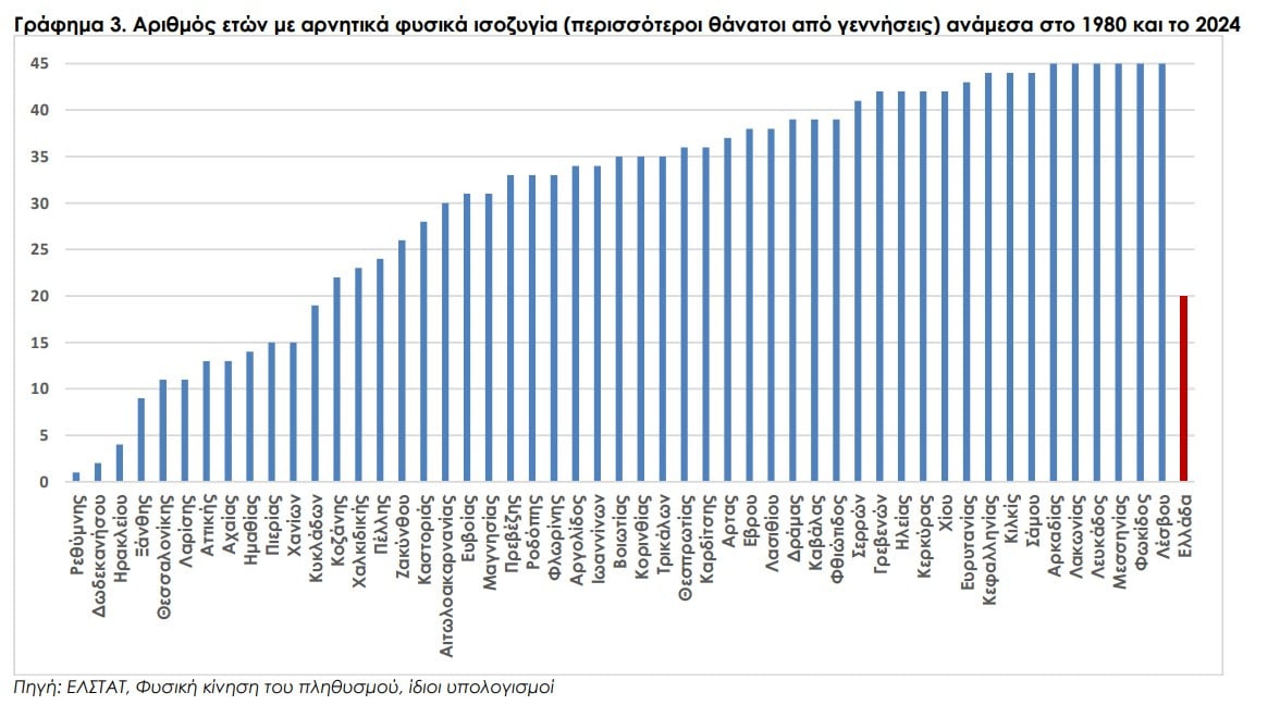Αντιθέτως, σε 3 νομούς (Ρέθυμνο, Δωδεκάνησα και Ηράκλειο) καταγράφονται αρνητικά φυσικά ισοζύγια για μόλις 1, 2 και 4 έτη, αντίστοιχα.