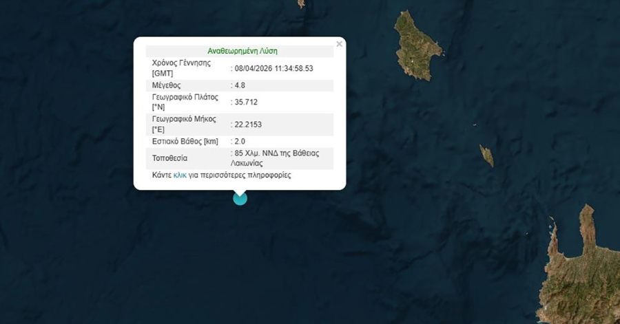 Το επίκεντρο της δόνησης εντοπίστηκε 85 χιλιόμετρα νότια-νοτιοδυτικά της Βάθειας Λακωνίας.