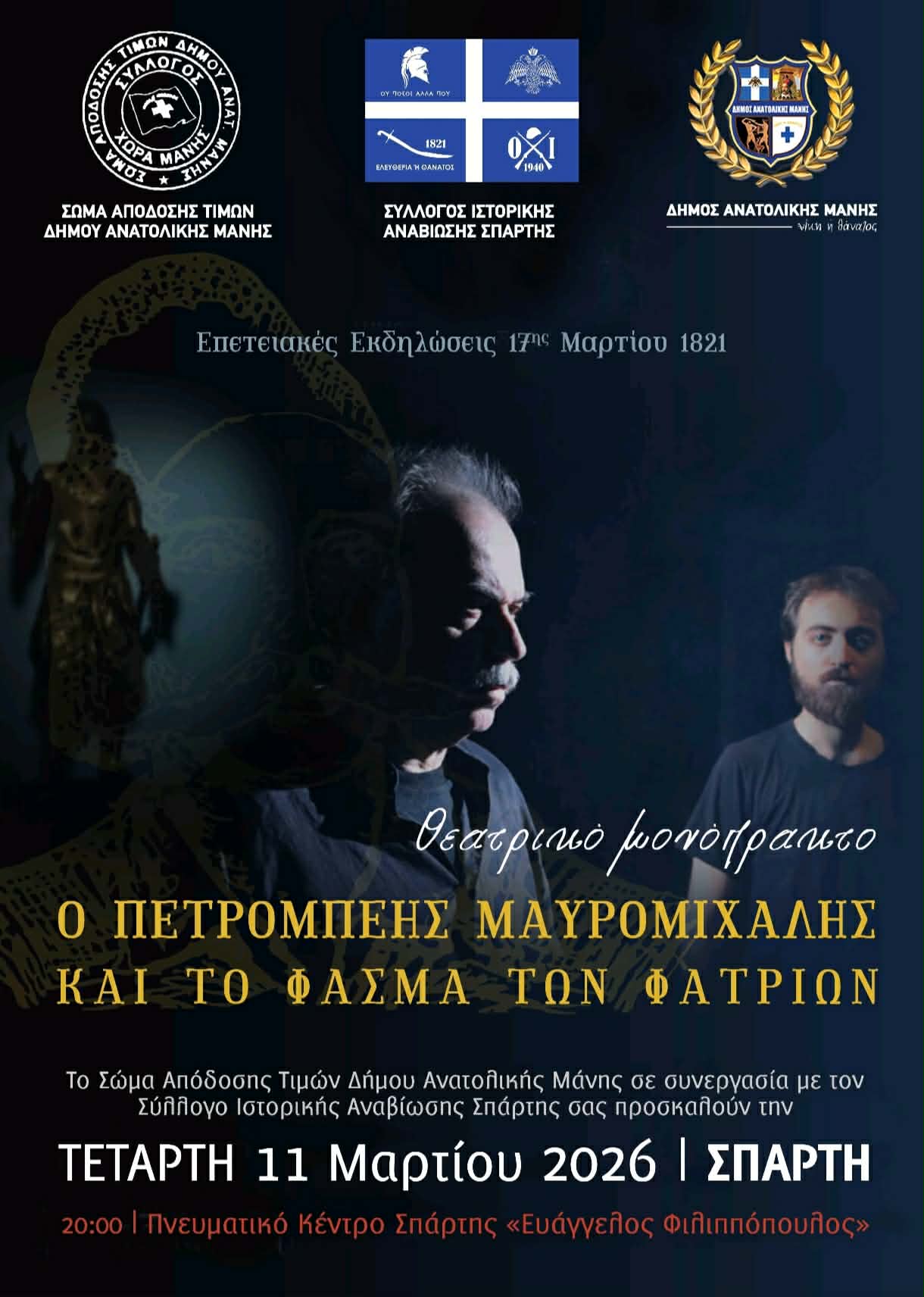 Το σώμα απόδοσης τιμών του Δήμου Ανατολικής Μάνης σε συνεργασία με το σύλλογο ιστορικής αναβίωσης Σπάρτης σας προσκαλούν στο θεατρικό μονόπρακτο " Ο Πετρόμπεης Μαυρομιχάλης και το φάσμα των φατριών ".