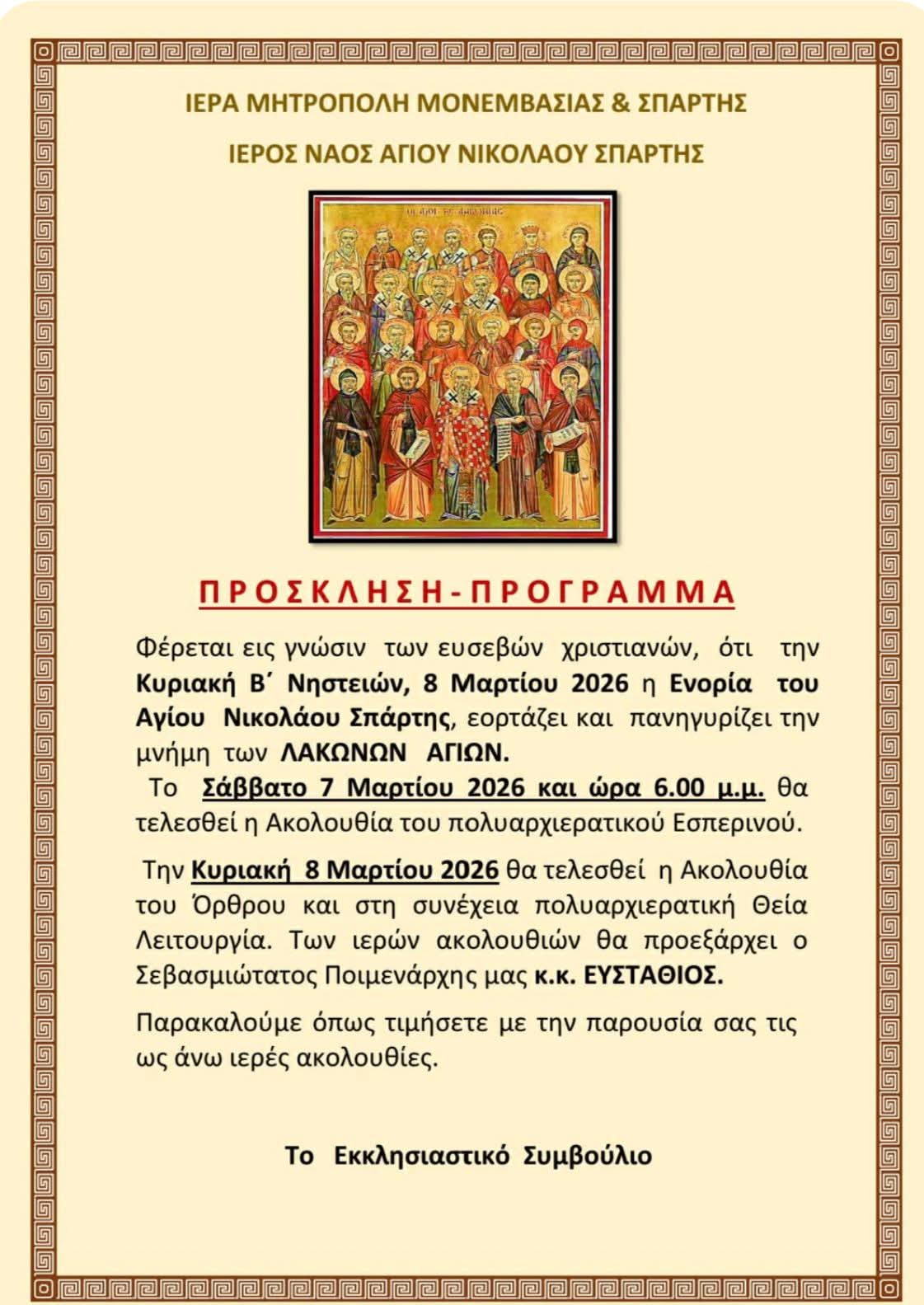 Η Ενορία Αγίου Νικολάου Σπάρτης εορτάζει τους Λάκωνες Αγίους.