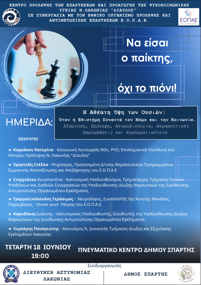 Η εξάρτηση από ουσίες ως κοινωνικό φαινόμενο, η πρόληψη, οι θεραπευτικές παρεμβάσεις και οι πρόνοιες του νομοθέτη για την αντιμετώπισή τους, αναμένεται να βρεθούν στο επίκεντρο της ημερίδας που συνδιοργανώνουν το Κέντρο Πρόληψης Εξαρτήσεων και Προαγωγής της Ψυχοκοινωνικής Υγείας Λακωνίας «Δίαυλος», ο Εθνικός Οργανισμός Πρόληψης και Αντιμετώπισης Εξαρτήσεων (ΕΟΠΑΕ), η Διεύθυνση Αστυνομίας Λακωνίας και ο Δήμος Σπάρτης.