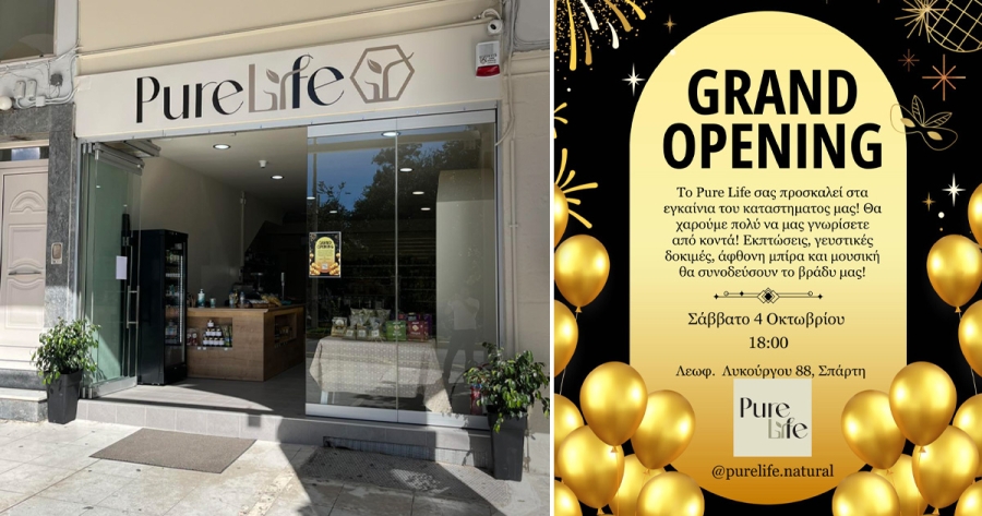 Στη Λυκούργου 88 στη Σπάρτη, λειτουργεί το νέο κατάστημα Pure Life, το οποίο προσφέρει ξηρούς καρπούς, αλείμματα, σνακ και τοπικά προϊόντα. Το κατάστημα έχει ήδη ανοίξει τις πόρτες του για το κοινό, ενώ τα επίσημα εγκαίνια αναμένεται να πραγματοποιηθούν το Σάββατο 4 Οκτωβρίου στις 18:00.
