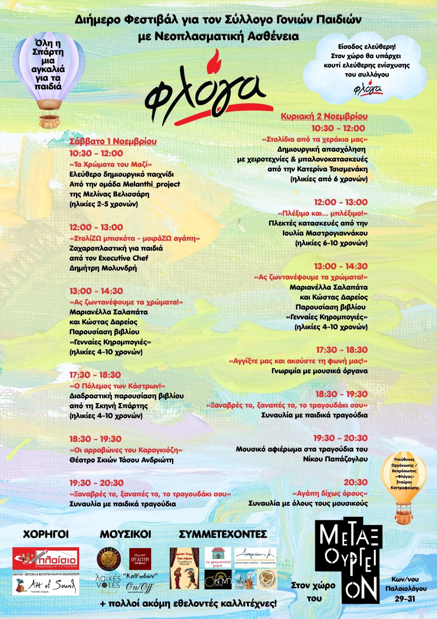 Για δύο μέρες, η Σπάρτη ενώνεται σε μια μεγάλη, φωτεινή γιορτή ελπίδας και ανθρωπιάς. Η είσοδος είναι ελεύθερη για όλους, ενώ στον χώρο θα υπάρχει κουτί ελεύθερης ενίσχυσης για τη στήριξη του έργου της «Φλόγας», που εδώ και δεκαετίες στέκεται στο πλευρό των παιδιών με νεοπλασματικές ασθένειες και των οικογενειών τους.