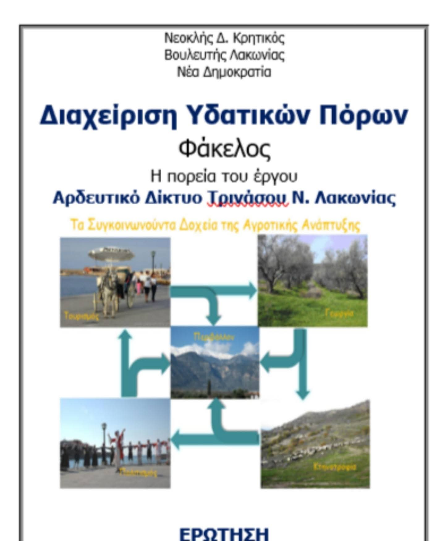 Στο πλαίσιο παρακολούθησης της πορείας υποψηφιότητας του Κλειστού Αρδευτικού Δικτύου Τρινάσου (Παρέμβαση Π3-73-1.1), ο βουλευτής Π.Ε. Λακωνίας κ. Νεοκλής Κρητικός επισκέφθηκε τη Γενική Γραμματέα Ενωσιακών Πόρων και Υποδομών κ. Αργυρώ Ζέρβα.