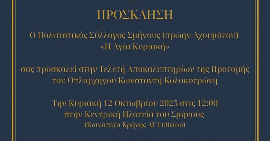 Ο Πολιτιστικός Σύλλογος Σμήνους (πρ. Αχουμάτου) "Η Αγία Κυριακή", έχει τη χαρά να σας προσκαλέσει στην Τελετή Αποκαλυπτηρίων της Προτομής του οπλαρχηγού Κωνσταντή Κολοκοτρώνη, που φιλοτέχνησε ο Λάκωνας γλύπτης Δημοσθένης Τζανάκος και κοσμεί τον αύλειο χώρο του Ιερού Ναού Αγίας Κυριακής, στην πλατείας του Σμήνους.