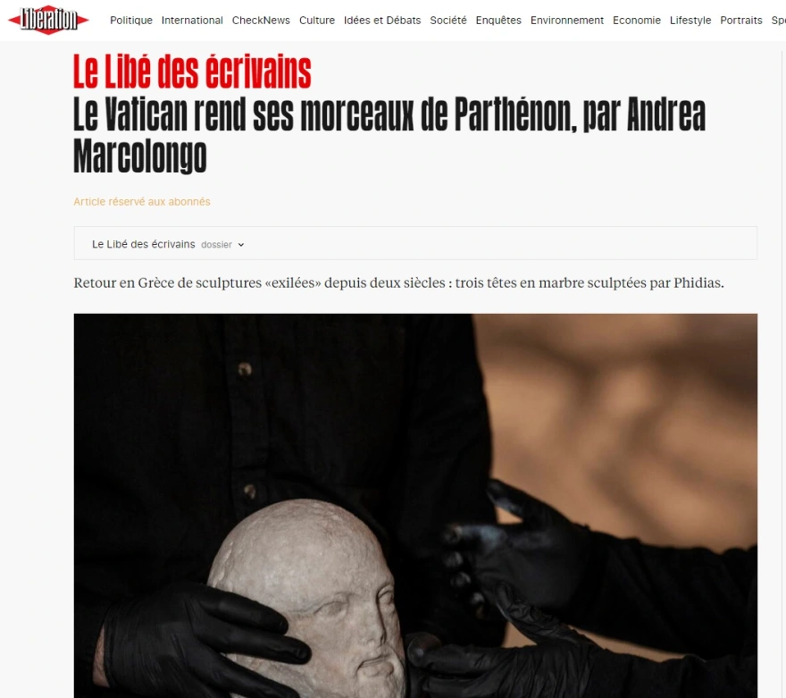 «Ο Πάπας Φραγκίσκος δήλωσε, ότι θέλει να διορθώσει μια αδικία 200 και πλέον ετών, μια θέση που χαιρέτισε η Λίνα Μενδώνη, η Ελληνίδα υπουργός Πολιτισμού» αναφέρει η Ιταλίδα συγγραφέας, τονίζοντας πως «όπου η πολιτική δεν έχει -ή δεν θέλει να έχει- τα νόμιμα μέσα (αφού τα έργα τέχνης ενός κράτους είναι αναπαλλοτρίωτα και δεν μπορούν σε καμία περίπτωση να μεταβιβαστούν) υπάρχει η θρησκεία». Επισημαίνει εν προκειμένω ότι η επιστροφή των τριών κεφαλών στην Ελλάδα έγινε στο πλαίσιο δωρεάς από την Καθολική Εκκλησία στην Ορθόδοξη Εκκλησία και όχι επιστροφή από κράτος σε κράτος. Ο Πάπας προσέφερε τα γλυπτά στον Αρχιεπίσκοπο Ιερώνυμο Β', ο οποίος με τη σειρά του αποφάσισε να τα δωρίσει στο Μουσείο της Ακρόπολης, σημειώνει.