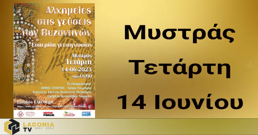 Ο Δήμος Σπάρτης (Τμήμα Τουρισμού), το Ινστιτούτο Έρευνας Βυζαντινού Πολιτισμού (ΙΝ.Ε.ΒΥ.Π.) και η Εφορεία Αρχαιοτήτων Λακωνίας (ΕΦ.Α.ΛΑΚ.) συνδιοργανώνουν Εσπερίδα Γευσιγνωσίας «Αλχημείες στις Γεύσεις των Βυζαντινών» την Τετάρτη 14 Ιουνίου 2023 ώρα 18:00 στον υπαίθριο χώρο του ΙΝ.Ε.ΒΥ.Π. στον νέο Μυστρά.