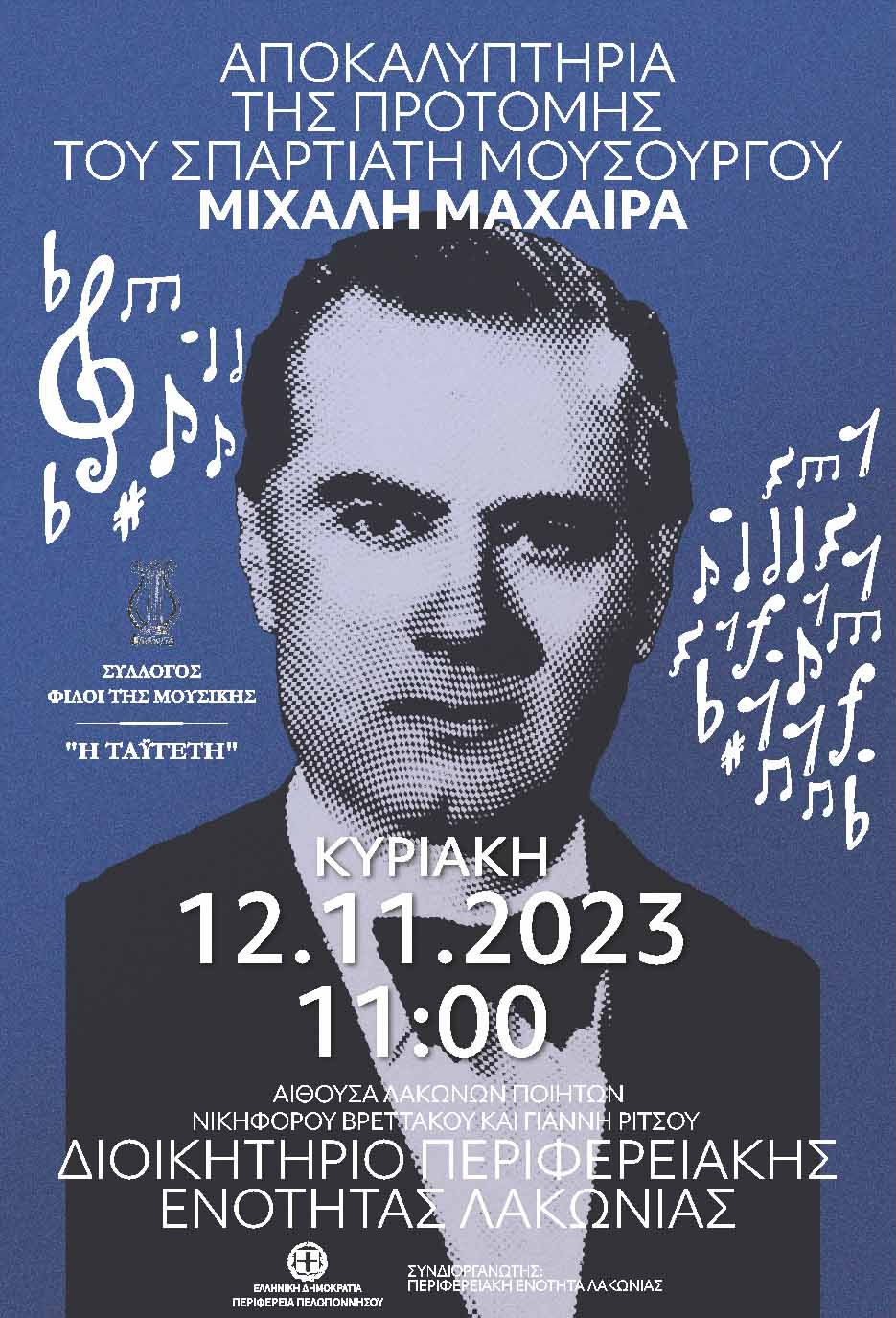 Ο Σύλλογος Φίλοι της Μουσικής «Η Ταϋγέτη» σε συνδιοργάνωση με την Περιφέρεια Πελοποννήσου σας προσκαλεί στην εκδήλωση αποκαλυπτηρίων της προτομής του αείμνηστου Σπαρτιάτη μουσουργού Μιχάλη Μαχαίρα.