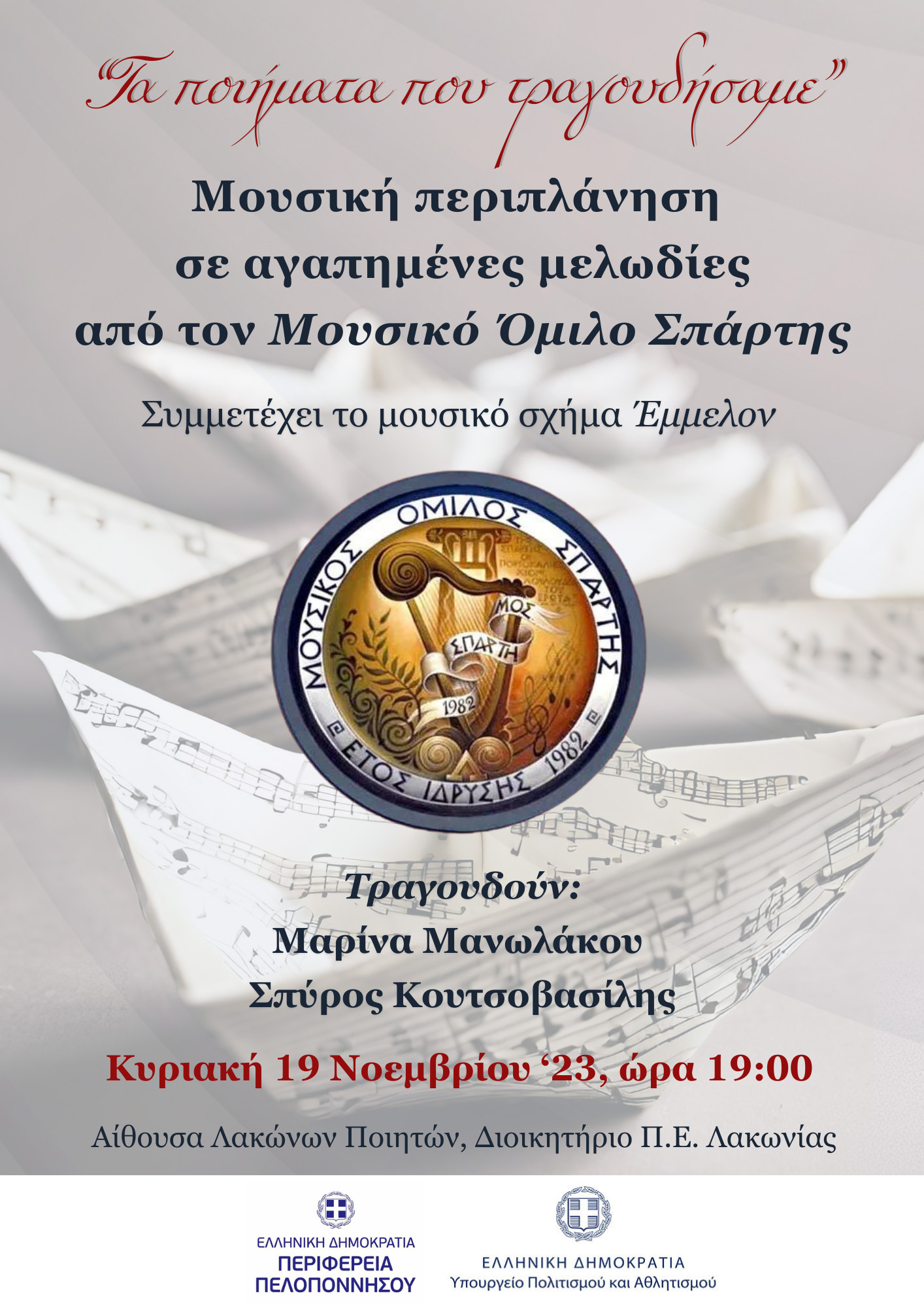 Ο Μουσικός Όμιλος Σπάρτης διοργανώνει συναυλία "Τα ποιήματα που αγαπήσαμε. Μουσική περιπλάνηση σε αγαπημένες μελωδίες με το Μουσικό Όμιλο Σπάρτης" την Κυριακή στις 19 Νοεμβρίου, στις 7 μ.μ. .