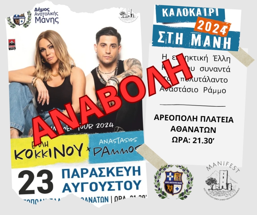Για αυτό το λόγο με μεγάλη μου λύπη θα πρέπει να αναβάλλω την προγραμματισμένη εμφάνιση μου στην Αρεόπολη Λακωνίας στις 23/8.