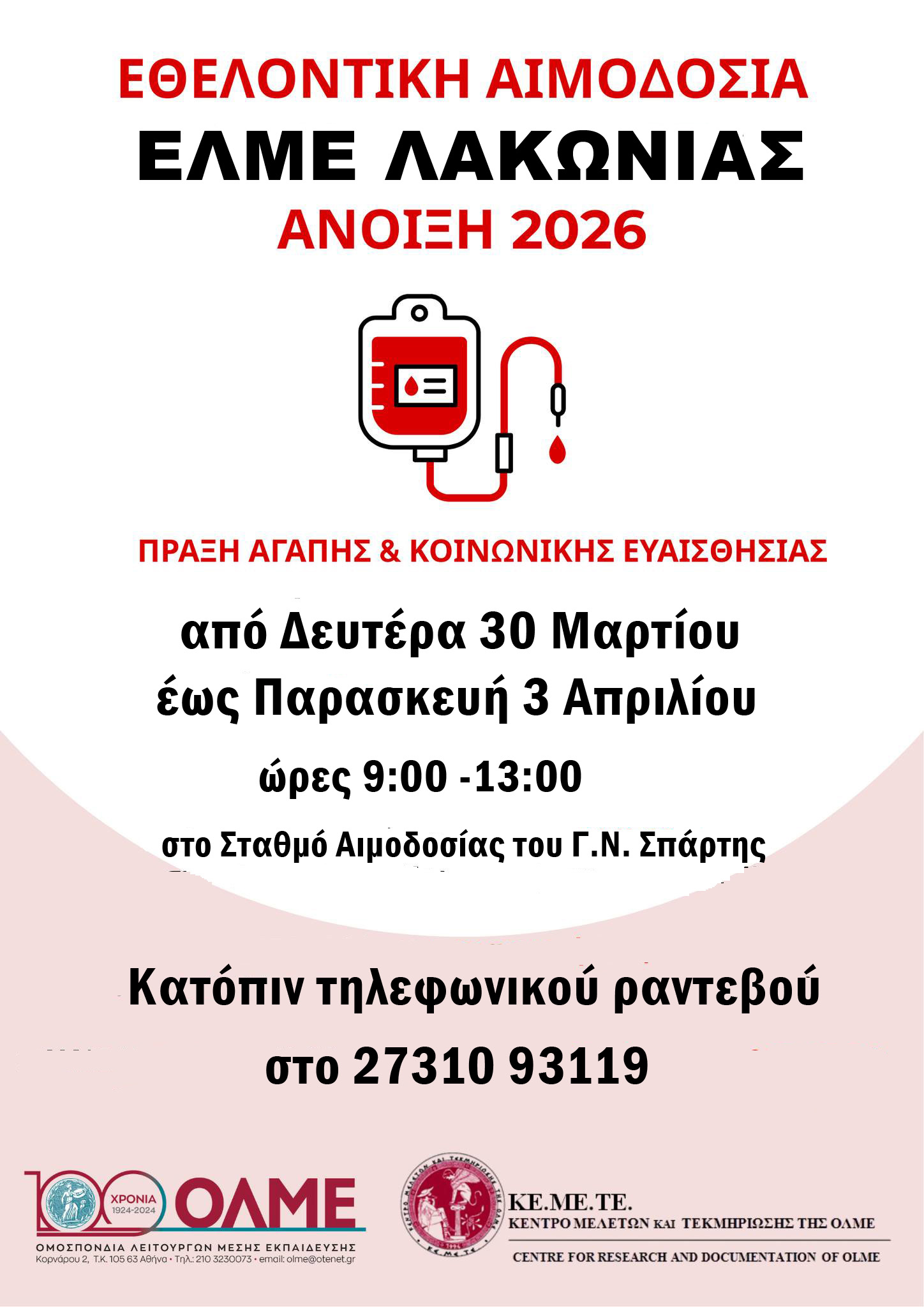 Η ΕΛΜΕ Λακωνίας σε συνεργασία με το Γενικό Νοσοκομείο Σπάρτης διοργανώνει εβδομάδα ΕΘΕΛΟΝΤΙΚΗΣ ΑΙΜΟΔΟΣΙΑΣ και σας καλούμε να προσέλθετε μαζικά σε αυτή τη προσφορά ανθρωπιάς και αλληλεγγύης..
